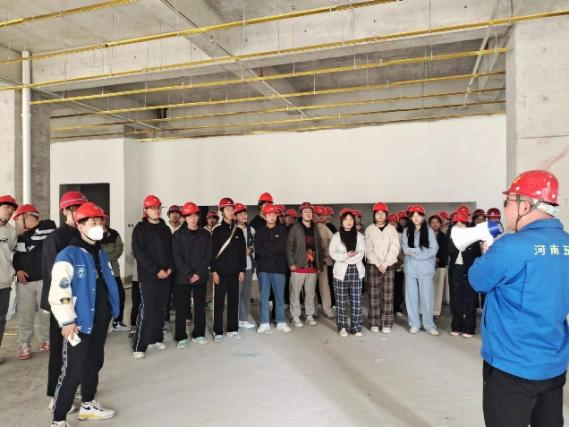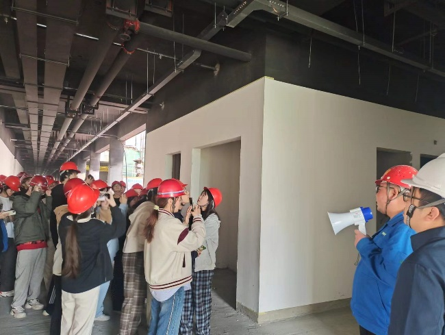 抵达现场后,实验科研综合楼一标段工地负责人,首先,对WilliamHILL中国工程管理专业师生的到来表示热烈的欢迎,并对实习过程中的安全注意事项做了介绍和要求。随后,现场技术负责人向同学们介绍了实验科研综合楼的工程概况以及目前的施工进度。结合现场的施工情况,详细讲解了室外玻璃幕墙的安装、超过24米脚手架搭设方案的论证、弧形梁的放样以及现场新材料的性能等内容。并带领同学们参观了装修样板间,详细介绍了墙面抹灰工序流程、地面装修的注意事项、天花板龙骨的间距以及卫生间的闭水试验等相关专业知识。