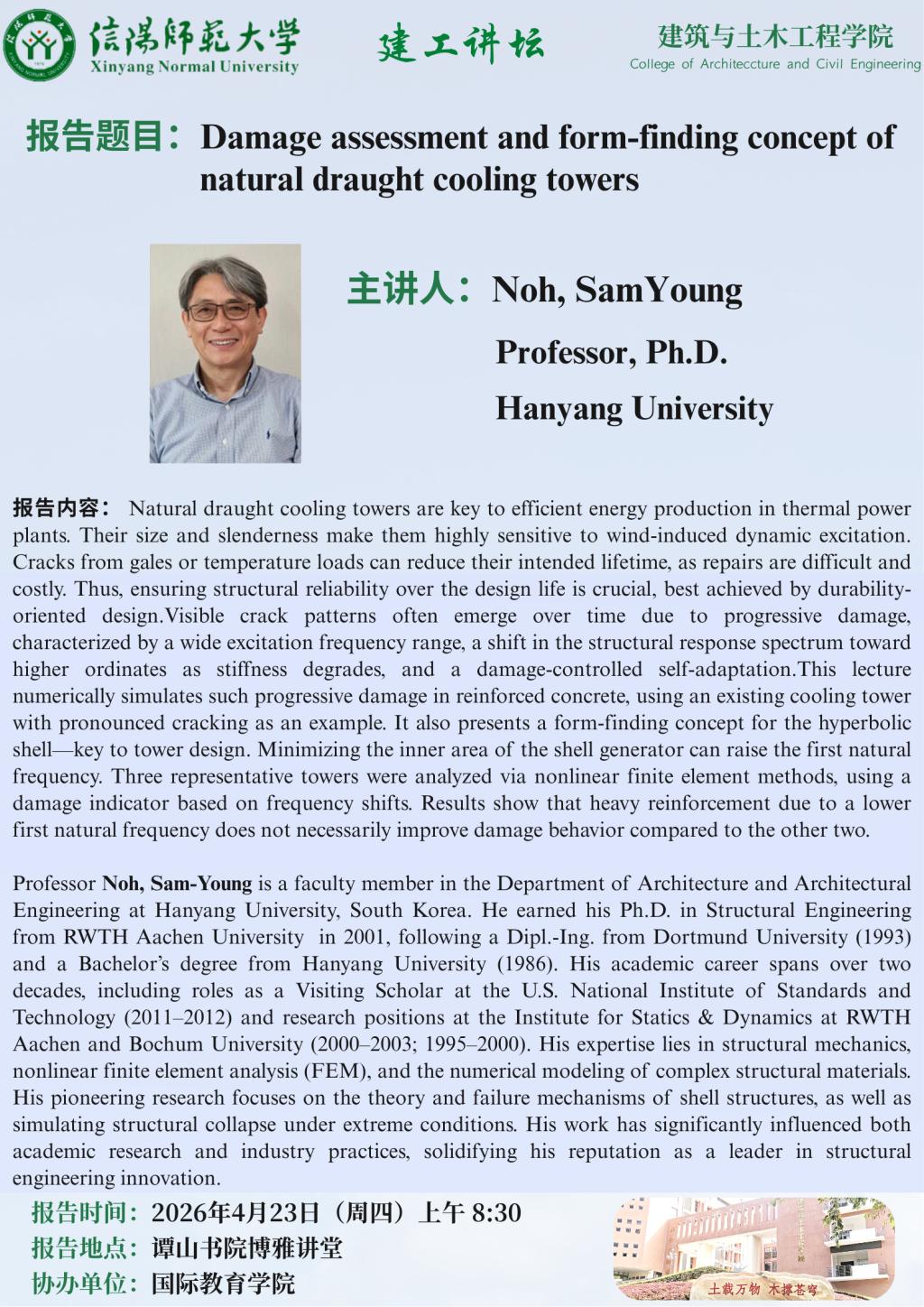 报告人简介:Professor Noh, Sam-Young is a faculty member in the Department of Architecture and Architectural Engineering at Hanyang University, South Korea. He earned his Ph.D. in Structural Engineering from RWTH Aachen University in 2001, following a Dipl.-Ing. from Dortmund University (1993) and a Bachelor’s degree from Hanyang University (1986). His academic career spans over two decades, including roles as a Visiting Scholar at the U.S. National Institute of Standards and Technology (2011–2012) and research positions at the Institute for Statics & Dynamics at RWTH Aachen and Bochum University (2000–2003; 1995–2000). His expertise lies in structural mechanics, nonlinear finite element analysis (FEM), and the numerical modeling of complex structural materials. His pioneering research focuses on the theory and failure mechanisms of shell structures, as well as simulating structural collapse under extreme conditions. His work has significantly influenced both academic research and industry practices, solidifying his reputation as a leader in structural engineering innovation.