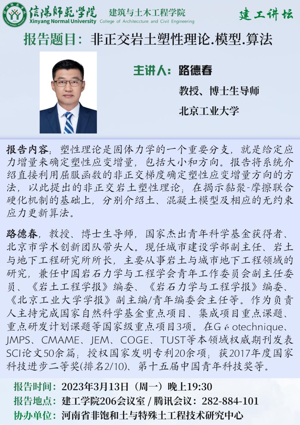 报告人简介:路德春,教授、博士生导师,国家杰出青年科学基金获得者、北京市学术创新团队带头人。现任城市建设学部副主任、岩土与地下工程研究所所长,主要从事岩土与城市地下工程领域的研究,兼任中国岩石力学与工程学会青年工作委员会副主任委员、《岩土工程学报》编委、《岩石力学与工程学报》编委、《北京工业大学学报》副主编/青年编委会主任等。作为负责人主持完成国家自然科学基金重点项目、集成项目重点课题、重点研发计划课题等国家级重点项目3项。在Géotechnique、JMPS、CMAME、JEM、COGE、TUST等本领域权威期刊发表SCI论文50余篇;授权国家发明专利20余项;获2017年度国家科技进步二等奖(排名2/10)、第十五届中国青年科技奖等。
