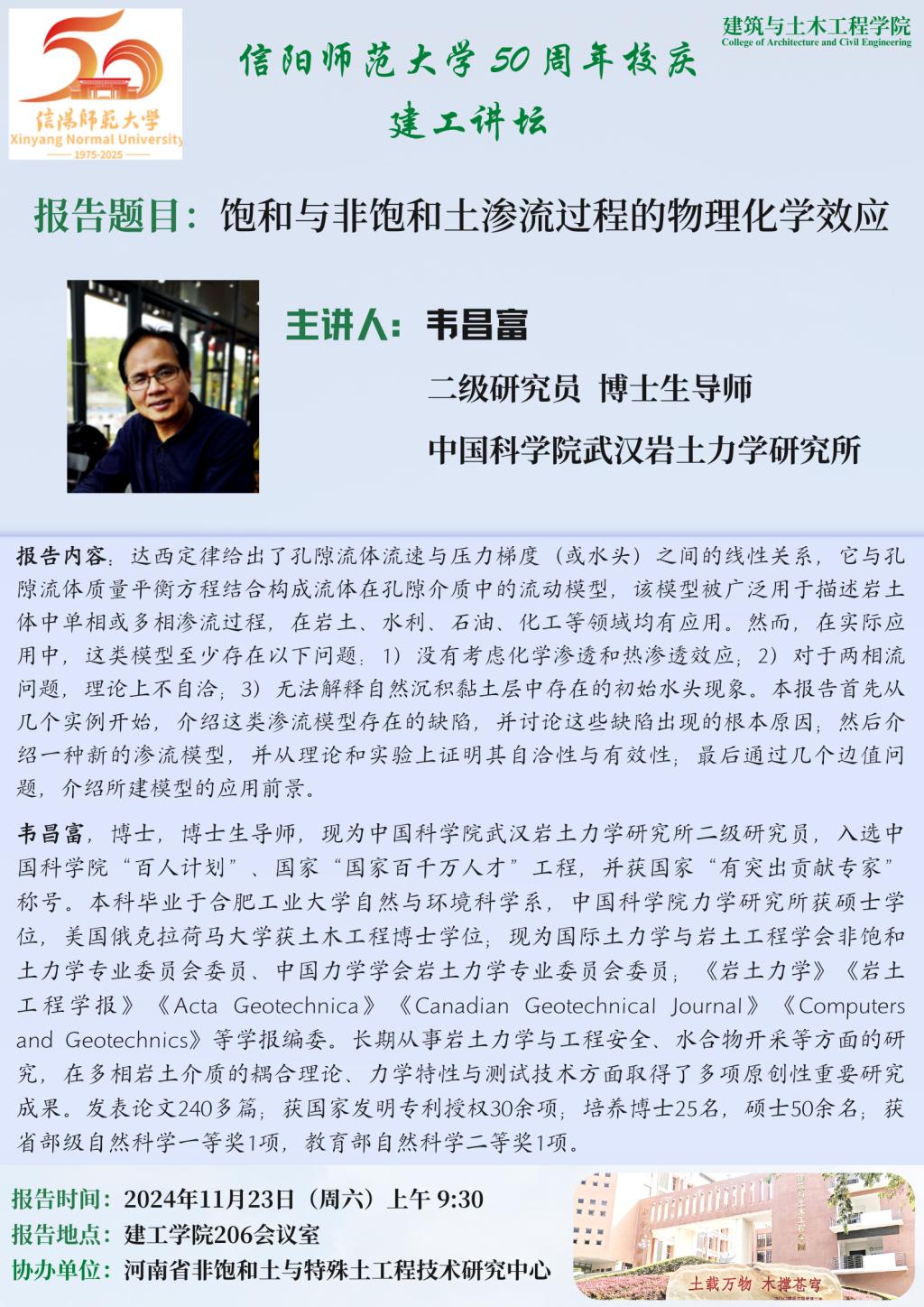 报告人简介:韦昌富,博士,博士生导师,现为中国科学院武汉岩土力学研究所二级研究员,入选中国科学院“百人计划”、国家“国家百千万人才”工程,并获国家“有突出贡献专家”称号。本科毕业于合肥工业大学自然与环境科学系,中国科学院力学研究所获硕士学位,美国俄克拉荷马大学获土木工程博士学位;现为国际土力学与岩土工程学会非饱和土力学专业委员会委员、中国力学学会岩土力学专业委员会委员;《岩土力学》《岩土工程学报》《Acta Geotechnica》《Canadian Geotechnical Journal》《Computers and Geotechnics》等学报编委。长期从事岩土力学与工程安全、水合物开采等方面的研究,在多相岩土介质的耦合理论、力学特性与测试技术方面取得了多项原创性重要研究成果。发表论文240多篇;获国家发明专利授权30余项;培养博士25名,硕士50余名;获省部级自然科学一等奖1项,教育部自然科学二等奖1项。