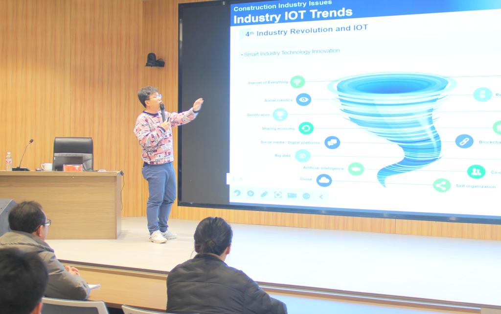 Ahn Yong Han教授报告题目为“Smart Construction Approaches and Technologies”,Ahn教授在报告中全面地介绍了智能建造在韩国建筑行业中的广泛应用场景,他指出智能建造是在建筑物和基础设施的规划、设计、施工和运营中整合建筑信息模型BIM、人工智能AI、物联网IoT、自动化、机器人等先进技术、数字工具的创新实践,以达到提高效率、节约成本、提高质量、增强安全性和节能环保的目的。