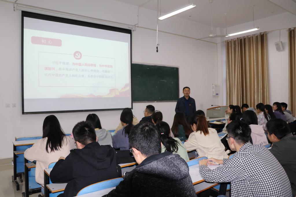 10月15日下午,学院党委副书记方明科在综合实验楼405教室为全体学生党员作了题为《砥砺初心担使命,无悔青春勇追梦》的专题党课。方明科深刻阐释了共产党人的初心和使命,深刻阐述了开展主题教育的重大意义,深刻阐明了主题教育的目标要求和重点措施。并对全体大学生党员提出了要求:一是要知党史,明国情。二是要听党话,跟党走。三是勇担当,善作为。方明科强调,广大青年学生党员要牢记为中国人民谋幸福,为中华民族谋复兴的初心和使命,自觉肩负起时代赋予的重任,努力在实现中华民族伟大复兴的中国梦的伟大实践中放飞青春梦想。
