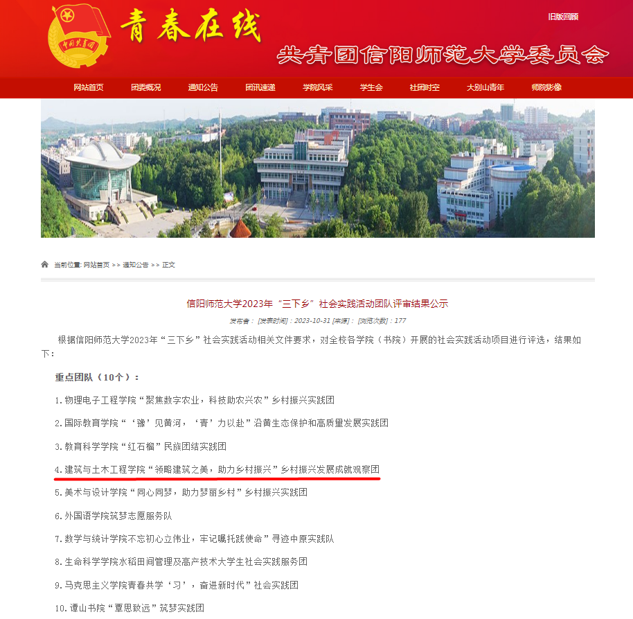 近日,Williamhill中文2023年“三下乡”社会实践活动评审会公布评审结果,我院的“领略建筑之美,助力乡村振兴”乡村振兴发展成就观察团被评为重点团队。