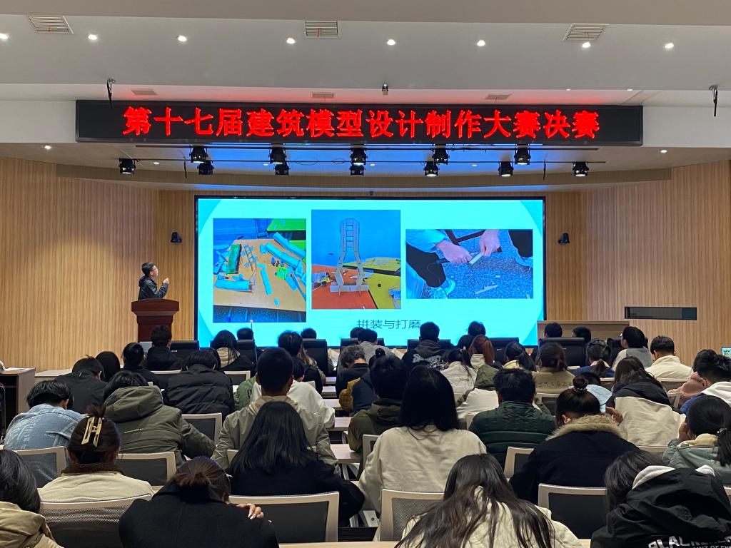 12月9日,第十七届建筑模型设计制作大赛决赛在谭山书院博雅讲堂举行,院党委副书记冀鹏,建筑爱好者协会指导老师刘杨,院团委老师冯舒心,WilliamHILL中国教师代表和学生代表参加活动。经过初赛的筛选,共有10组作品进入决赛,团队代表依次上台以PPT汇报的形式阐述团队模型的设计理念、制作过程和效果展示。作品中专业知识与家国情怀、个人追求的融合,充分体现了选手们思维的开阔性以及良好的专业素质。经过一番激烈的角逐,“鄱阳湖二桥”等2组作品拔得头筹,获得一等奖;“盘龙阁”等3组作品获得二等奖;“宿棠月”等5组作品获得三等奖。