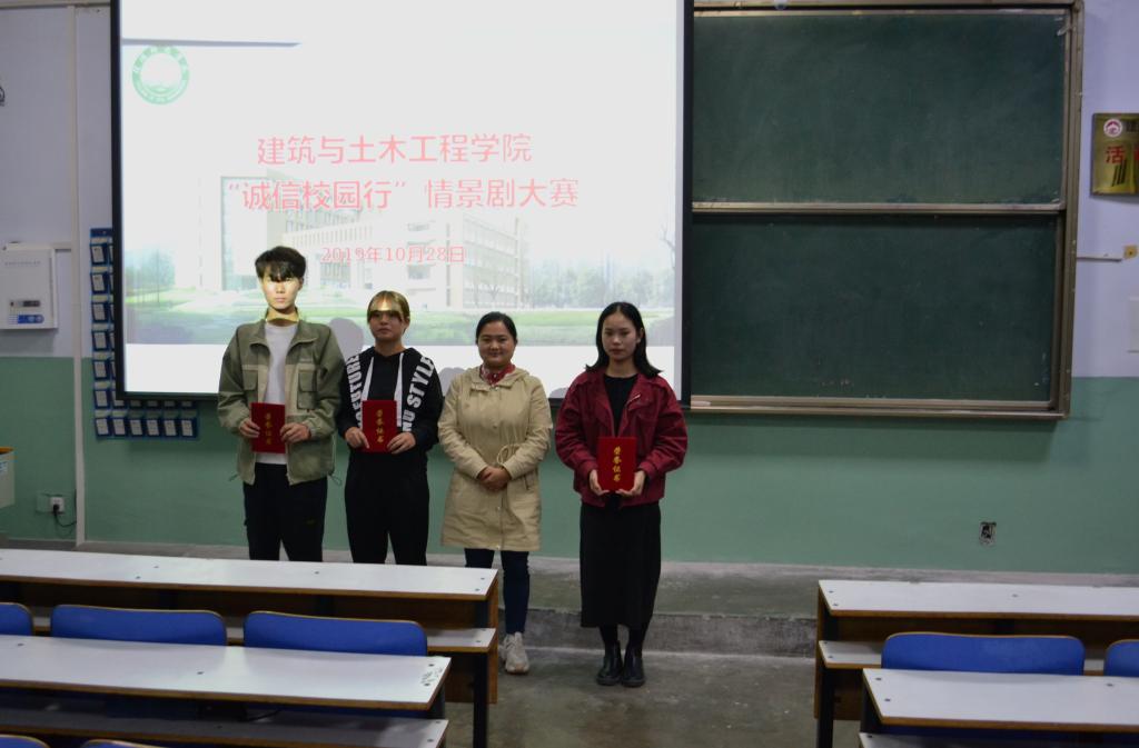 大赛以“诚信筑未来,奋进新时代”为主题,在为期两个周的宣传发动阶段,各班级通过班级宣传、剧本的筛选等最终推举出7支队伍参加此次比赛。参加比赛的作品均以助学贷款、助学金、勤工俭学等资助为线索展开,贴近大学生实际生活,形式丰富多样,赢得了现场观众热烈的掌声。经过两个多小时的激烈角逐,19级工程管理班的《迷途知返》、19级土木一班的《谁更傻》和18级工程管理班的《诚信教育》以其贴近主题、表演生动形象依此获得了本次比赛的一、二、三等奖。最终决定由19级工程管理班的《迷途知返》代表我院参加校级评选。活动的最后,邓林老师对每个短剧进行评价,并对各组选手的精彩表现给予肯定,且为选手们在短剧情景设置、出场细节、道具准备等方面存在的不足提出了具体改进意见。精彩的点评让在场的选手们纷纷表示不枉此行,收获颇多。