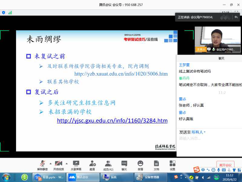 4月22日上午,建工学院专门利用考研指导群和腾讯会议的形式,组织召开了2020届学生考研复试的“云指导”专题课堂。60余名考研学子参加了本次云上指导会。