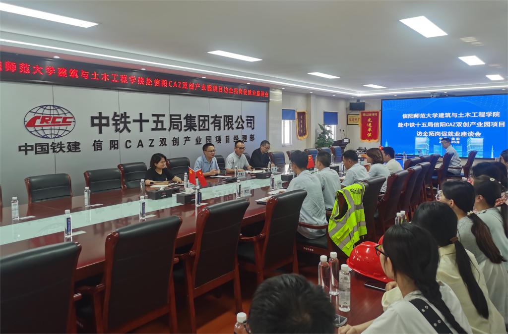 访企拓岗过程中,方明科一行与信阳CAZ项目负责人进行了座谈交流。方明科向企业介绍了近年来校院发展概况和2024届毕业生基本情况,中铁十五局集团城市建设工程有限公司信阳CAZ双创产业园项目副总经理冀洪凡详细介绍了中铁十五局企业概况、项目开发现状和行业发展形势,现场展示了信阳CAZ项目创优和技术创新情况。与会双方围绕企业用人需求、毕业生素质提升、实践能力训练等内容进行了深入交流,并就进一步深化合作进行了深入探讨。