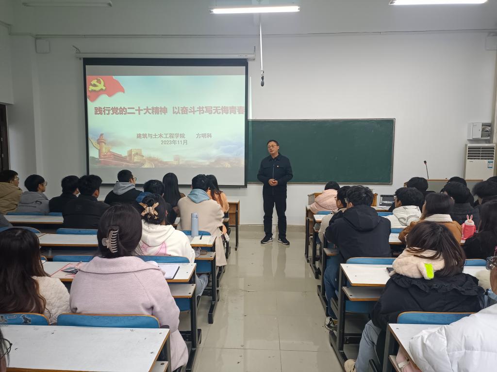 开班仪式结束后,方明科为培训班学员作了题为“践行党的二十大精神 以奋斗书写无悔青春”的首场辅导报告。方明科首先从党的二十大主题、主要成果、过去5年的工作和新时代10年的三件大事和伟大变革、在16个方面取得的主要成就、全面建设社会主义现代化国家的目标任务,坚持党的全面领导和全面从严治党,应对风险挑战,教育、科技、人才工作的部署等方面对党的二十大精神进行了深入解读。接着,方明科结合学院专业特点和优秀校友事迹,激励同学们树立远大理想,锤炼过硬本领,脚踏实地、实学实干、勇于创新,主动担当作为,立志做有理想、敢担当、能吃苦、肯奋斗的新时代好青年,以昂扬奋进的姿态书写下无愧于时代的壮丽篇章,让青春在全面建设社会主义现代化国家的火热实践中绽放绚丽之花。
