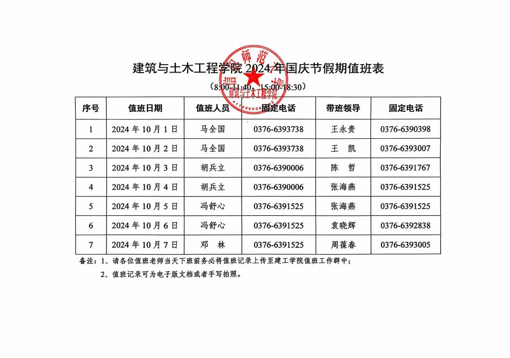 建工学院2024年国庆节假期值班表